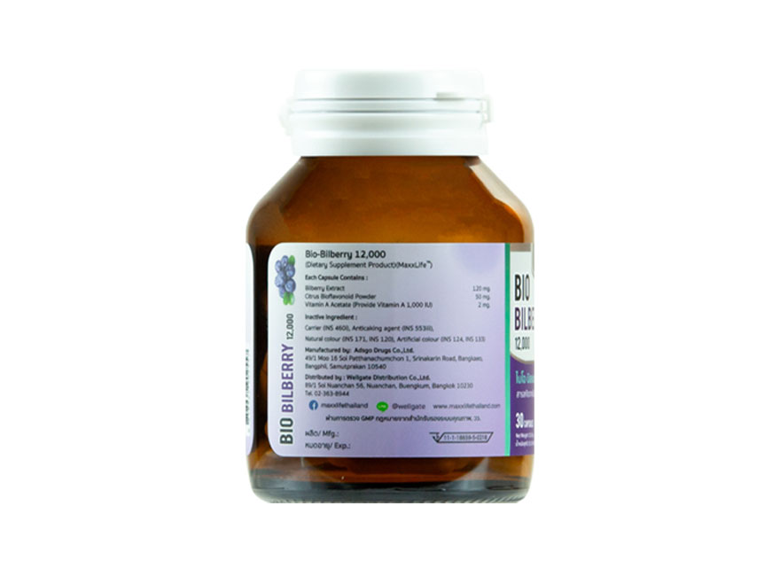 ทำจากสารสกัดบิลเบอร์รี่ 120 mg เทียบเท่า บิลเบอร์รี่สด 12,000 mg